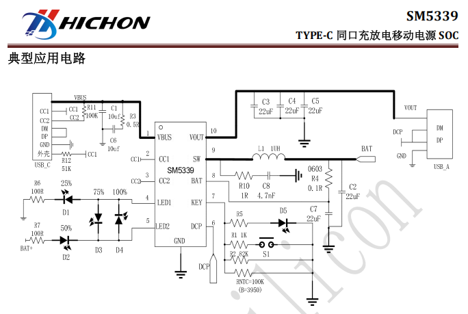 M5339 是一款集成升壓轉換器、鋰電池充 電管理、電池電量指示的多功能電源管理 SOC, 為移動電源提供完整的電源解決方案。 得益于 SM5339 的高集成度與豐富功能,使 其在應用時僅需極少的外圍器件,并有效減小整 ...