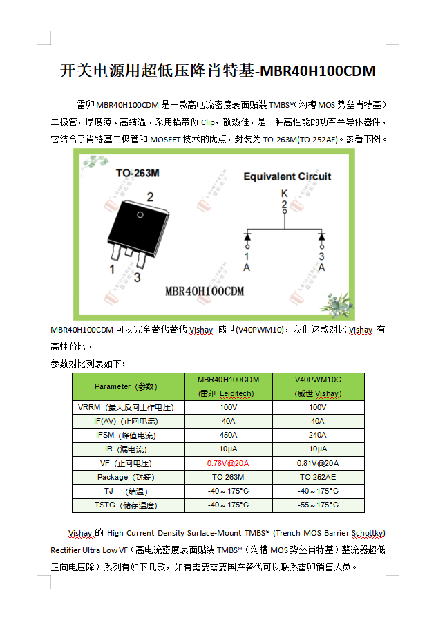 開關電源用超低壓降肖特基-MBR40H100CDM