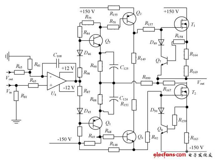 正文摘要:我在一篇碩士論文上看到一個OCL功率放大電路,如下圖所示: 電壓放大電路原理圖如圖1所示。Vin是D/ A轉換后的電壓信號輸入端,Vout 是電壓輸出端。整個電路由輸入級(運放U4) 、中間級( 三級管Q1 ,Q2 ,Q4 ,Q5) 和由MO ... |