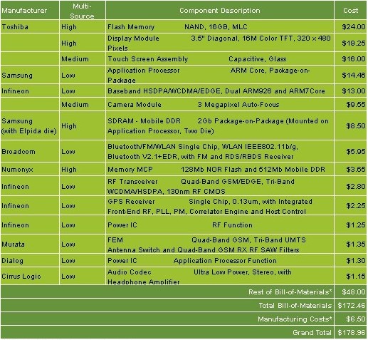 由于新款iPhone 3G S手機的材料成本及功能與上一款iPhone系列手機幾乎完全相同,人們可能會認為該產品所用的零部件也不會有多大變化。但經過iSuppli公司拆機分析團隊的拆解,發現其零部件及供應商有一些有趣的變化。 “蘋果公司推出的新款入門級16Gb iPhone 3G S手機的材料成本為172.46美元,制造成本為6.50美元,即總成本為178.96美元,” iSuppli拆機分析業務總監兼首席分析師Andrew Rassweiler說。“iSuppli根據 2008年7月的零部件價格對原先的低端8Gb iPhone 3G手機的成本估計是174.33美元,略低于iPhone 3G S 手機178.96美元的總成本。盡管16Gb iPhone 3G S手機的零售價格為199美元,與原先8Gb iPhone 3G的價格相同,但業務提供商為這款手機支付的實際價格則高得多——這也是無線通信行業普遍采用的商業模式,即通過月服務費的利潤來補貼支付給蘋果公司每部手機的費用。” 下圖所示為iPhone 3G S手機的主要零部件成本一覽表。 ![]() 來源:iSuppli 公司,2009年6月 本報告中的成本數據只包含iPhone 3G S手機的材料成本,不包括其它成本,如軟件開發、運輸與分銷、包裝,授權許可費以及每部手機的各種附件成本等。 今年的手機款型 除了速度更快,與舊款3G手機相比iPhone 3G S還支持視頻捕捉功能,它帶有一個能夠自動對焦的300萬像素攝像頭 (以前為200萬像素),以及一個內置的數碼指南針。除此之外,3G S的其它硬件功能則與以前的3G手機相差不大。 “從零部件及設計來看, 3G手機與3G S手機極其相似。蘋果公司利用這種相似性使材料成本達到最低,同時抓住電子零部件市場價格下滑的時機,推出存儲容量更大、功能更多及性能更好的產品,而材料及制造成本則只是高出少許,”Rassweiler說。“然而,與一年前推出的iPhone 3G相比,iPhone 3G S在零部件的選擇上又有明顯的不同。” Broadcom和Dialog擠身iPhone iPhone 3G S手機在硬件上較為明顯的一個變化是使用了Broadcom公司的單芯片藍牙/FM/WLAN,成本5.95美元。將所有這些功能集成到一個芯片中,表明這一行業正向更高程度的集成化發展。以前的3G使用兩個部件來實現這些功能:一個是Marvell Technology Group Ltd的WLAN芯片,另一個是Cambridge Silicon Radio (CSR) 的藍牙IC。 Dialog Semiconductor公司的電源管理IC也首次應用于iPhone系列3G S手機的應用處理器。Diaglog芯片取代了3G中使用的NXP Semiconductors部件,成本估計為1.3美元。 STMicroelectronics和AKM在3G S中占一席之地 為了實現數碼指南針功能,iPhone 3G S中增加了兩個三軸部件:AKM Semiconductor公司的電子指南針和STMicroelectronics公司的加速器。STMicroelectronics部件使3G S可判斷設備的方位和傾斜度,AKM傳感器則可檢測設備相對于磁北的移動,使3G S能夠根據用戶所面對的方向對顯示屏上的地圖重新定向。 Infineon和TriQuint地位穩固 iPhone 3G S手機推出之前,人們普遍認為Qualcomm可能取代Infineon Technologies AG,為其提供關鍵的基帶芯片。但是,Infineon以其PMB8878基帶芯片不可動搖地在3G S中占據重要位置,它在3G S部件成本中占13美元。TriQuint作為3G電源放大器模塊供應商同樣地位穩固,它支持3G S電話三頻HSPA功能。 成本最貴的零部件 Toshiba的16Gb MLC NAND閃存成為3G S手機中成本最高的單項設計,為24美元。供應受限使NAND閃存的價格幾個月來不斷上升,Toshiba的這一設計為3G S手機所采納將帶來可觀的利潤。雖然Toshiba是這款被iSuppli拆解的3G S手機的NAND供應商,但蘋果公司也可能采用其它供應商來提供這種部件,最有可能的是Samsung Electronics。 Samsung仍然保有其iPhone應用處理器供應商的位置。iPhone 3G S的零部件中價格最貴的幾種部件依次為NAND閃存、顯示模塊及觸摸屏組件,應用處理器位列第4,為14.46美元。 應用處理器為iPhone 3G S速度的提高發揮了至關重要的作用。在3G手機中,該處理器使用一個時鐘速度為400 MHz的ARM RISC微處理器;在3G S中,時鐘速度則為600MHz。 |