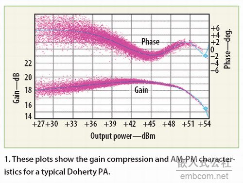 在無線系統(tǒng)中,功放(PA)線性度和效率常是必須權衡的兩個參數(shù)。工程師都在尋找一種有效而靈活的基于Volterra的自適應預失真技術,可用于實現(xiàn)寬帶RF功放的高線性度。本文將概述不同數(shù)字預失真技術,介紹一種創(chuàng)新性DPD線性化電路特有的自適應算法。 在 無線系統(tǒng)中,功放(PA)線性度和效率常是必須權衡的兩個參數(shù)。幸運的是,基于Volterra的自適應數(shù)字預失真(DPD)線性化電路可以使無線系統(tǒng)中 的射頻PA達到高線性度高效率。這種自適應數(shù)字預失真方案擴展了功放的線性范圍,同時波峰因數(shù)有降低,可以更強力驅動射頻PA,而且效率更高,同時滿足傳 輸譜效率要求及調制精度要求。 這種新型數(shù)字前置補償器已經(jīng)集成到了德州儀器公司(www.ti.com)的GC5322型 集成發(fā)射方案中。幾百萬門專用信號處理器(ASSP)采用0.13微米CMOS工藝制造,并且包含了數(shù)字上轉換、振幅因數(shù)降低以及數(shù)字預失真。這種“調制 不可知”處理器支持30 MHz信號帶寬。對第三代(3G)手機信號,可以降低峰值功率與平均功率之比(PAR)達6dB。對正交頻分復用技術(OFDM),可以改進4 dB,同時滿足鄰近信道功率比(ACPR) 和誤差矢量幅值特性?梢孕拚哌_11階的非線性并達到200 ns的PA存儲效應。對多種射頻PA拓撲,一般可改善ACPR 超過20dB,并且功率效率提高4倍以上,對一般基站,靜態(tài)功率損耗可降低60%之多。這種靈活的基于Volterra的預處理器可以為多種射頻架構、調 制標準和信號帶寬而優(yōu)化。 像用在3G和其它新興空中接口標準中的非恒定包絡調制方案在譜上更高效,但峰均信號比更高,PA的 回退必然更高。這樣就降低了PA效率并增加了基站的冷卻和運行成本。功效低一些的射頻PA一般占總基站系統(tǒng)成本的30%,對環(huán)境影響相當顯著。隨著向“綠 色”的不斷發(fā)展,能源效率高的技術與不斷增加的能源成本、以及目前不斷提高的譜效率和及信號帶寬要求,還有正在發(fā)展的標準結合起來,使功放線性度成為下一 代基站的關鍵設計問題。多年來,提出并實施了大量的功放線性化技術,如射頻前饋、射頻后饋以及RF/IF預失真和后失真。其中,與傳統(tǒng)模擬/射頻線性化技 術相比,自適應DPD方案已證明效率最高并且最有成本效益。DSP/ASSP計算能力的不斷增加使數(shù)字預失真成為越發(fā)吸引人的選項。 GC5322 發(fā)射方案將數(shù)字上變換(DUC)、振幅因數(shù)降低(CFR)以及DPD結合在高度集成的ASSP中,采用德州儀器公司C67x型DSP內置軟件提供的實時自 適應控制。這種發(fā)射器件可以為多種射頻架構優(yōu)化,支持多種空中接口標準,包括CDMA2000、WCDMA、TD-SCDMA、MC-GSM、WiMAX 和長期演進(LTE)手機標準。這種靈活的前置補償器可以與多種功率拓撲一起有效使用,如A/B類或Doherty放大器,設計為支持信號帶寬達30 MHz的通信系統(tǒng)。此文章分為兩篇,集中說明DPD方案的硬件實現(xiàn)。 基于3G CDMA的無線通信系統(tǒng)以及采用像OFDM方法的多載波系統(tǒng)?梢蕴幚砀逷AR或振幅因數(shù)信號。非恒定包絡調制技術,如這些系統(tǒng)中使用的正交調幅具有嚴格 的誤差矢量幅度(EVM)要求。因為有這些要求,所以需要PA為高線性幅度和相位響應。PA的線性工作范圍一般有限。PA非線性會引起發(fā)射信號互調失真, 導致譜?裂和鄰信道功率比(ACPR)的下降。這一問題的一種簡單解決方法是把輸入信號水平回退到PA,這樣得到的信號就完全處于放大器的線性工作區(qū)。遺 憾的是,PA功率效率在較低輸入功率下下降相當大,使這種方法比最佳方法要遜色。此外,更加高級有效的放大器拓撲(如Doherty PA)甚至在回退功率水平下也出現(xiàn)相當大的非線性,導致EVM和ACPR性能變差。 在回退狀態(tài)下工作時,目前使用的傳統(tǒng)AB 類功放的效率在5%~10%之間。但使用了振幅因數(shù)降低和自適應DPD技術后,效率可以提高3~5倍。更新型的PA拓撲,如Doherty放大器,或者甚 至動態(tài)包絡軌跡與DPD 結合起來的AB類放大器,以及更新型的器件技術,如氮化鎵(GaN)或砷化鎵(GaAs)功率晶體管,可以用于獲得接近50%的效率。 當前的DPD實現(xiàn)大多數(shù)采用無記憶線性化技術,其中采用瞬間非線性(預失真)來補償PA的瞬間非線性行為。無記憶性功率放大器的 特點是其幅度和相位傳輸特性,此特性一般指AM到AM(即增益壓縮)和AM到PM特性。對這種無記憶性功放,可以采用一種通用查詢表(LUT)做前置補償 器增益/相位校正。圖1示意了一種典型Doherty PA的增益壓縮和AM-PM特性。因為PA的增益和相位特性隨溫度、電壓、元件老化而變化,要達到真正高效和有效的線性化,就需要自適應控制查詢表。
