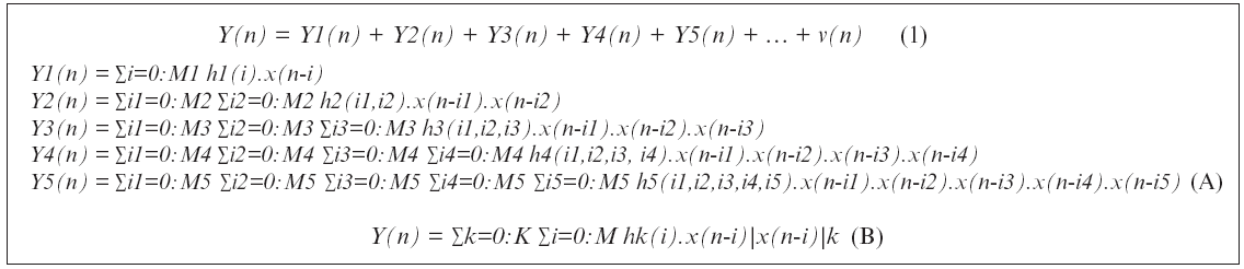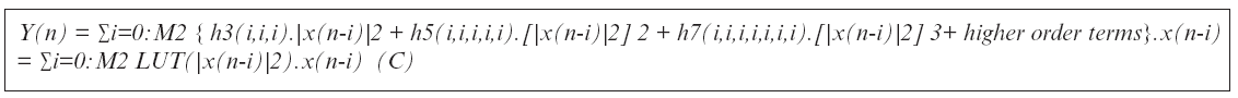 對 于PA必須支持更高射頻調制帶寬的通信系統(tǒng),無記憶模式證明還不夠,因為它只依賴于幅度,而不是依賴于頻率。必須支持大信號帶寬的PA表現(xiàn)出明顯的記憶效 應,這是由于DC偏置網(wǎng)絡中元件的時間常數(shù)大,以及有源器件的快速熱效應。這樣造成PA特性隨早先輸入水平而變,因此需要使用能降低記憶效應的預失真結 構。 任何高效的線性化方案都要求前置補償器有高度精確的模型,如果PA采用直接學習自適應架構,則也要求有高度精確的模型。 文獻中提出了大量具有記憶性的非線性系統(tǒng)模型化技術,沒有一種方法能是一個普遍的解決方案。因此,模型選擇很難,并且依賴于應用。有效的PA模型必須能以 合理的精度表示不同類型的非線性和記憶效應。 Volterra數(shù)列是一種更普遍的具有記憶性的時變非線性系統(tǒng)模型。包括多維卷積之和,分立 時間因果形式下可以寫成式1,式A詳細給出條件,其中多維矩陣h1、h2、… hn為模型化非線性的n階Volterra系數(shù),Mn為非線性的有限記憶長度。鑒于RF PA考慮到長記憶深度(達1微秒)和非線性級(達11級),上述模型在數(shù)學上無法處理。必須采用簡化方案以得到實際的前置補償器產(chǎn)品。這些簡化可以分為兩 種基本方法:算術法和模型簡化法。對第一種,式1中的一般Volterra模型具有許多吸引人的算術特征,可以用于得到高效實現(xiàn)方案。對于模型簡化法,雖 然需要完整的一般Volterra(或者某些其它一般模型),如大家所知,RF功率放大器模型一般有大量Volterra項,這些項在實施中沒有意義。這 些項可以丟棄,不會造成線性性能出現(xiàn)可測量的惡化。