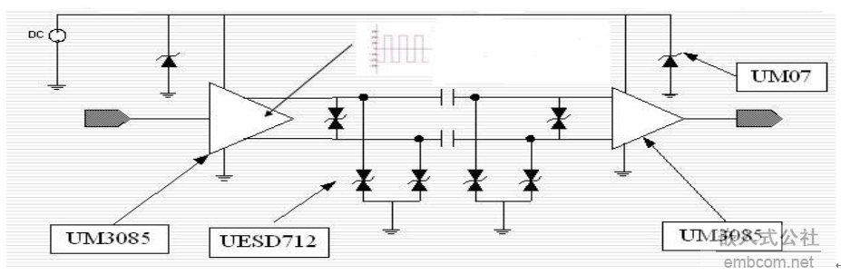 RS-485接口芯片能擔當起一種電平轉化的角色,把TTL信號、COMS信號等轉化為能在485總線上傳輸的差分信號,把接收到的485差分信號轉化為MCU能夠識別的TTL或COMS電平,在工業控制、儀器、儀表、多媒體網絡、機電一體化產品等諸多領域得到了廣泛應用。但在RS485通信中,常常會存在通信距離不遠、通信質量差等問題。為提高RS485的通信質量,除了采用終端匹配的總線型結構外,在系統設計中通常要考慮以下幾個問題。 1.故障保護 根 據RS-485的標準規定,接收器的接收靈敏度為±200mV,這意味著當接收端的差分電壓大于等于+200mV時,接收器輸出為高電平,小于等于 -200mV時輸出為低電平,介于±200mV之間時,接收器輸出為不確定狀態。在總線空閑(即傳輸線上所有節點都為接收狀態)以及傳輸線開路或短路故障 時,若不采取特殊措施,接收器可能輸出高電平或者低電平。一旦某個節點的接收器產生低電平,就會使串行接收器(UART)找不到起始位,從而引起通信異常。 為 解決該問題,很多RS485接口芯片引入了故障保護。例如,上海英聯電子的UM3085/UM3088輸入靈敏度為-50mV/-200mV,即差分接收 器輸入電壓UA-B≥-50mV時,接收器輸出邏輯高電平,如果UA-B≤-200mV,則輸出邏輯低電平。當接收器輸入端總線短路或總線上所有發送器被 禁止時,接收器差分輸入端為0V,從而確保總線空閑、短路時接收器輸出高電平。 2.防雷電沖擊 RS- 485接口芯片在使用、焊接或設備的運輸途中都有可能受到靜電沖擊而損壞。在傳輸線架設于戶外的使用場合,接口芯片乃至整個系統還有可能遭受雷電襲擊。選 用抗靜電或抗雷擊的芯片可有效避免此類損失。UM3085/UM3088芯片內部集成了ESD保護電路,人體模型ESD保護和機器模型ESD保護分別達到 15kV和2kV。此外,英聯電子還有一套完善的ESD保護方案(圖1),使系統能在更為苛刻的瞬態高壓沖擊環境中可靠運行。