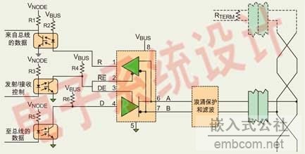 RS485芯片的供電電源通常來自于變壓器,當出現較為惡劣電壓變化時,電源上可能會出現一些瞬態浪涌高壓,圖中UM07可以很好地將這些瞬態電壓鉗位,保護接口芯片。與此同時,對于總線的兩個通信端口,采用UESD712進行保護,可以起到很好的防雷效果。 3.光耦隔離 在 某些工業控制領域,由于現場情況十分復雜,各個節點之間存在很高的共模電壓。雖然RS-485接口采用差分傳輸方式,具有一定的抗共模干擾能力,但當共模 電壓超過RS-485接收器的極限接收電壓,即大于+12V或小于-7V時,接收器就無法正常工作,嚴重時甚至會燒毀芯片和儀器設備。 解決方法是通過DC/DC轉換器將系統電源和RS-485收發器的電源進行光耦隔離(圖2),徹底消除共模電壓的影響,并濾除接地回路和傳導噪聲引起的干擾。