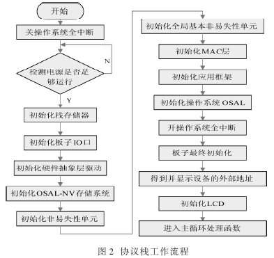 )。主函數(shù)的主要工作流程如圖2所示。需要注意的是,Zigbee協(xié)議棧的精華在于操作系統(tǒng)OSAL的任務(wù)調(diào)度,因此,在進(jìn)入主循環(huán)處理函數(shù)之前的準(zhǔn)備工