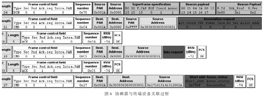 2.3 組網(wǎng) 利用數(shù)據(jù)分析儀[3]記錄監(jiān)控協(xié)調(diào)器與終端設(shè)備的組網(wǎng)過(guò)程如圖6所示。
