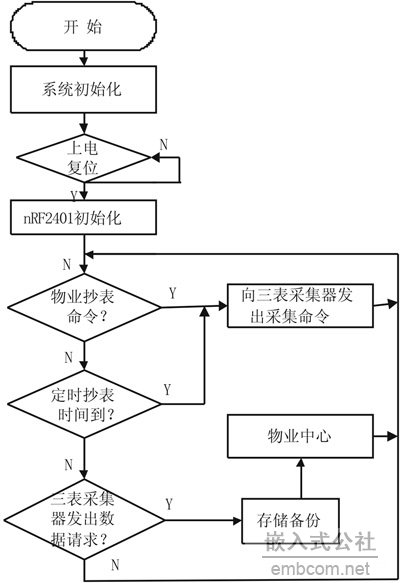 集中器電路設計注意事項 射頻部分的電路設計是集中器設計的重點與難點,也是集中器設計成功的關鍵。抗干擾設計直接關系到射頻性能和整個集中器的運轉情況。在射頻部分布線時,合理的布局與布線及采用多層板既是布線所必須的也是降低電磁干擾提高抗干擾能力的有效手段。 布線時需要注意以下幾點:一是射頻部分電路沒有用做布線的面積均需用銅填充并連接到地,以提供RF屏蔽達到有效抗干擾的目的 ;二是nRF2401芯片底部應接地 ;為了降低延遲、減少串擾,確保高頻信號的傳輸,要使用多個接地過孔將nRF2401芯片底部和地層相連; 三是盡可能地減少串擾,減少分布參數的影響,器件要緊密地分布在nRF2401 的四周,并使用較小封裝。 集中器軟件設計 集中器的主要任務是完成與小區物業中心和三表數據采集終端的通信。集中器的通信包括兩部分:與小區物業中心的計算機通過nRF2401 無線通信模塊與集中器進行通信;集中器通過nRF2401 無線通信模塊與三表數據采集終端進行通信.集中器主程序流程圖如圖5所示.