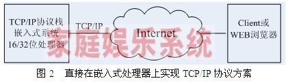 (2)通過直接在嵌入式處理器上實現(xiàn)TCP/IP協(xié)議來實現(xiàn)Internet接入功能這種方案沒有使用操作系統(tǒng),大大節(jié)省了資源,但是對處理器的性能要求較高,同時增加了開發(fā)的難度,技術(shù)實現(xiàn)上也比較困難。如圖2所示。