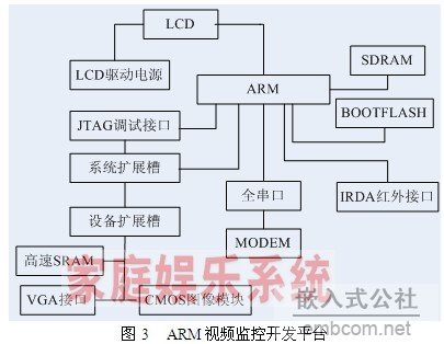 (3)采用一個基于ARM Linux 的網(wǎng)絡(luò)監(jiān)控系統(tǒng) 這 種方案和第二種方案類似,但是它只用嵌入式ARM Linux 操作系統(tǒng),在操作系統(tǒng)上運行TCP/IP 協(xié)議。目前大多數(shù)嵌入式操作系統(tǒng)都帶有TCP/IP協(xié)議棧,這降低了開發(fā)的難度,實現(xiàn)起來比較靈活。由于嵌入式操作系統(tǒng)的運行需要占用相當(dāng)?shù)奶幚砥髻Y源和 存儲器空間,對硬件配置也有較高的要求。采用第三種方案,可以節(jié)省開發(fā)時間、縮短開發(fā)周期。監(jiān)控系統(tǒng)一般都還要在控制現(xiàn)場配置一臺工控機或高性能微機做服 務(wù)器,用來存儲中間數(shù)據(jù),處理實時性要求較高的事件,響應(yīng)監(jiān)控終端的監(jiān)控請求。 2 監(jiān)控系統(tǒng)硬件設(shè)計 采 用基于ARM嵌入式的網(wǎng)絡(luò)監(jiān)控系統(tǒng),它采用TCP/IP網(wǎng)絡(luò)協(xié)議標(biāo)準(zhǔn),系統(tǒng)組網(wǎng)簡單,傳輸數(shù)據(jù)量大,速度快,整個系統(tǒng)結(jié)構(gòu)簡單。尺寸微小、價格低廉。遠(yuǎn)程 計算機可做到無需額外程序,通過WEB瀏覽器就能對設(shè)備進(jìn)行檢測,而且應(yīng)用程序易于開發(fā)、實現(xiàn)信息的完整共享。在該系統(tǒng)中ARM負(fù)責(zé)程序控制和網(wǎng)絡(luò)通信, 圖像和視頻采集模塊負(fù)責(zé)數(shù)據(jù)獲取和處理。當(dāng)數(shù)據(jù)或命令數(shù)據(jù)傳輸過來后,ARM系統(tǒng)進(jìn)行命令處理后,將命令數(shù)據(jù)傳輸或顯示在LCD上,同時系統(tǒng)負(fù)責(zé)將處理的 結(jié)果經(jīng)過網(wǎng)絡(luò)接口上傳出去。系統(tǒng)接收到數(shù)據(jù)命令后,經(jīng)過算法處理后,驅(qū)動D/A輸出或根據(jù)A/D輸入進(jìn)行數(shù)據(jù)處理后,將結(jié)果傳給ARM。系統(tǒng)具有以下幾個 基本功能:數(shù)據(jù)采集、數(shù)據(jù)分析和處理、程序控制、網(wǎng)絡(luò)傳輸。 2.1 ARM視頻監(jiān)控平臺 如圖3所示為視頻監(jiān)控應(yīng)用系統(tǒng)的開發(fā)平臺。ARM的系統(tǒng)擴展槽和設(shè)備擴展槽,用于為ARM系統(tǒng)添加如以太網(wǎng)接口、海口數(shù)據(jù)存儲接口和PCMCIA等接口,或者用于其他的功能開發(fā)板,為ARM系統(tǒng)擴展了CMOS圖像獲取功能和VGA顯示功能。