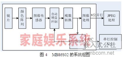 其中,VGA接口是通過電阻網(wǎng)絡(luò)實現(xiàn)4096色彩色顯示。與SRAM訪問相關(guān)的寄存器有:SDRAM控制寄存器、讀地址低16位、讀地址高16位、讀出數(shù)據(jù)寄存器、寫地址低16位、寫地址高16位、寫入數(shù)據(jù)寄存器;與CMOS圖像采集有關(guān)的寄存器有CMOS采集控制寄存器、CMOS采集狀態(tài)寄存器;與VGA顯示有關(guān)的寄存器是VGA顯示控制寄存器。它具有以下特點: (1)實時性好,能滿足數(shù)據(jù)采集和數(shù)據(jù)處理的實時性要求。 (2)性價比高,在滿足要求的情況下,系統(tǒng)成本應(yīng)盡量低。 (3)可控性好,能夠?qū)崿F(xiàn)遠(yuǎn)距離控制和數(shù)據(jù)傳輸。 2.2數(shù)據(jù)采集模塊 視 頻源信號來自于一個高集成度的CMOS數(shù)字圖像傳感器模塊MB86S20,它是富士通的產(chǎn)品。MB86S02不但集成了CMOS圖像傳感陣列、自動增益信 號放大器、模數(shù)轉(zhuǎn)換器,還包括了色彩信號處理和微型鏡頭,包含了圖像采集的所有前端處理,可以直接輸出數(shù)字信號。模塊的系統(tǒng)框圖如圖4。