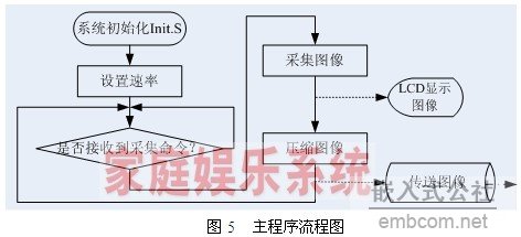 MB86S02是基于CMOS工藝,使用有源像素的傳感器,與傳統(tǒng)的CCD傳感器相比有如下不同點。 (1)成像過程 ccd和cmos使用相同的光敏材料,因而受光后產(chǎn)生電子的基本原理相同,但是讀取過程不同:ccd是在同步信號和時鐘信號的配合下以幀或行的方式轉(zhuǎn)移,整個電路非常復(fù)雜,讀出速率慢;cmos 則以類似 dram的方式讀出信號,電路簡單,讀出速率高。 (2)集成度 采 用特殊技術(shù)的ccd讀出電路比較復(fù)雜,很難將a/d轉(zhuǎn)換、信號處理、自動增益控制、精密放大和存儲功能集成到一塊芯片上,一般需要 3~8 個芯片組合實現(xiàn),同時還需要一個多通道非標(biāo)準(zhǔn)供電電壓。借助于大規(guī)模集成制造工藝,cmos圖像傳感器能非常容易地把上述功能集成到單一芯片上,多數(shù) cmos圖像傳感器同時具有模擬和數(shù)字輸出信號。 (3)電源、功耗和體積 ccd需多種電源供電,功耗較大,體積也比較大。cmos只需一個單電源(3v~5 v)供電,其功耗相當(dāng)于ccd的1/10,高度集成cmos芯片可以做的相當(dāng)小。 (4)性能指標(biāo) ccd 技術(shù)已經(jīng)相當(dāng)成熟,而 cmos正處于蓬勃發(fā)展時期,雖然目前高端cmos圖像質(zhì)量暫時不如ccd,但有些指標(biāo)(如傳輸速率等方面)已超過ccd。由于cmos具有諸多優(yōu)點,國 內(nèi)外許多機構(gòu)已經(jīng)應(yīng)用cmos圖像傳感器開發(fā)出眾多產(chǎn)品。本文主要介紹已商品化的cmos圖像傳感器的發(fā)展現(xiàn)狀以及最新發(fā)展動態(tài),希望對下游產(chǎn)品的開發(fā)有 所幫助 CMOS技術(shù)的最大優(yōu)點是每一個像素單元可以集成一個或多個晶體管,這樣就具有了低功耗和小型化的優(yōu)點,非常適用于手持設(shè)備,可以降低系統(tǒng)功耗、體積,提高電池效率;它的高度集成性大大簡化了圖像應(yīng)用系統(tǒng)的設(shè)計。 MB86S02的主要特性如下: 嵌 入式處理器通過與MB86S02 CMOS圖像模塊的連接,讀取圖像數(shù)據(jù)后通過同步SRAM接口存儲在外部高速SRAM中,然后還可以由UART模塊或RTL8019模塊把已經(jīng)存儲的圖像 數(shù)據(jù)發(fā)送到PC,最后PC上的接收程序?qū)@示接收的圖像。通過調(diào)試板上的按鍵可以選擇采集圖像、地址復(fù)位、串口發(fā)送、網(wǎng)口發(fā)送這幾種功能。 3 監(jiān)控系統(tǒng)軟件設(shè)計 如圖5所示是ARM主程序流程圖。ARM處理器獲取圖像信息,執(zhí)行壓縮程序,壓縮后的文件通過公共電話線路傳遞到監(jiān)控主機端。由于系統(tǒng)采用相同的圖像分辨率和常量表,所以文件頭都相同。為了減少傳輸數(shù)據(jù)量,不傳送文件頭,文件頭在監(jiān)控主機端由軟件自動添加。